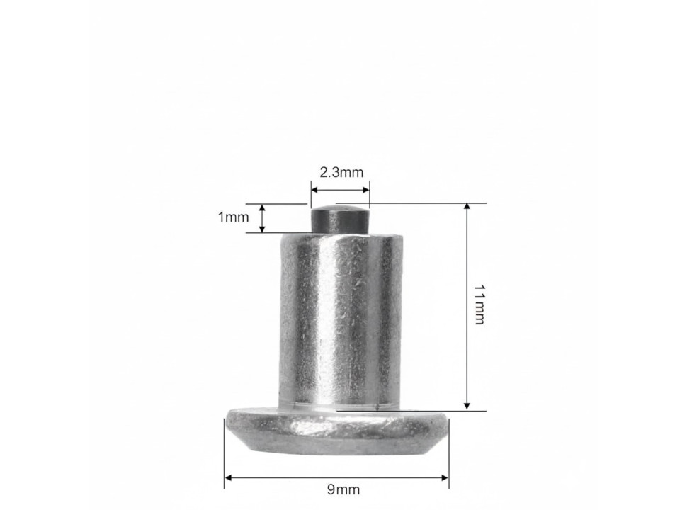 La parte superior del clavo (pin) presenta un diámetro de Ø 2,30 mm, mientras que el vástago (shank) alcanza Ø 4,90 mm. Con un peso aproximado de 2,000 g por unidad, este modelo combina firmeza de anclaje y ligereza, optimizando el equilibrio y el rendimiento del neumático.