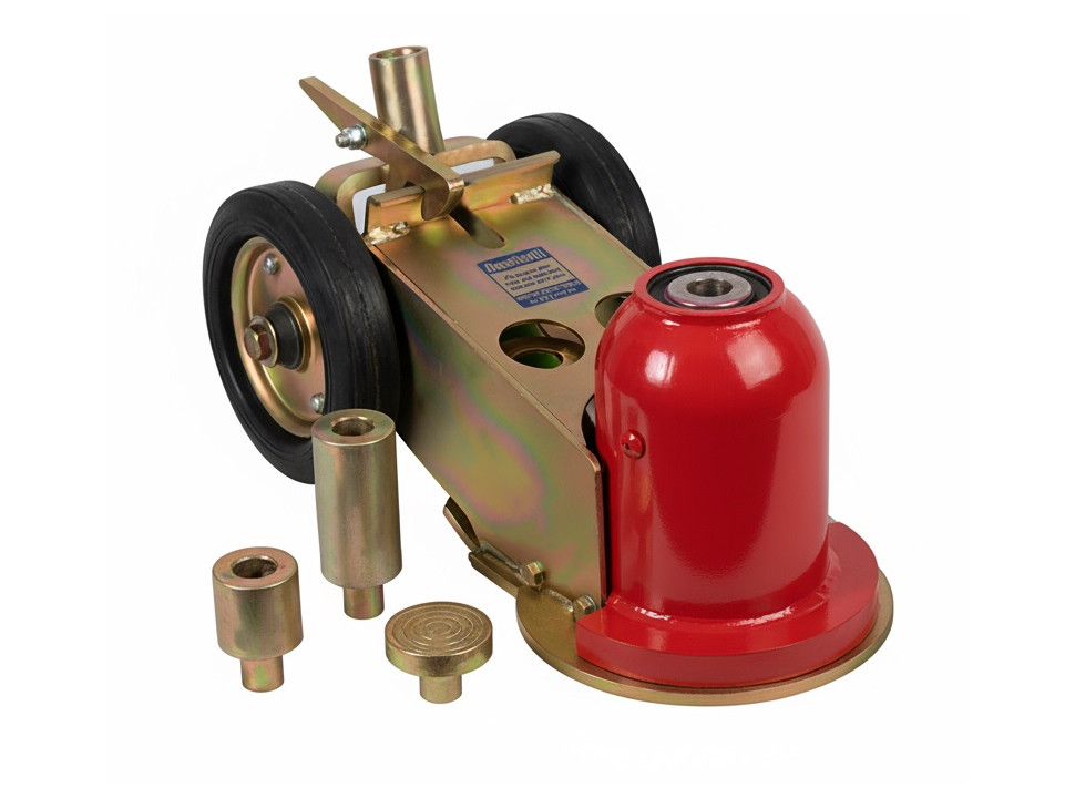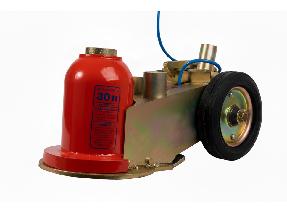 Crique hidroneumático montado sobre chasis zincado con ruedas, pensado para trabajo intensivo en flotas y equipos pesados; ofrece elevación rápida, estable y de baja manutención gracias a su eje cromado y accesorios de apoyo.