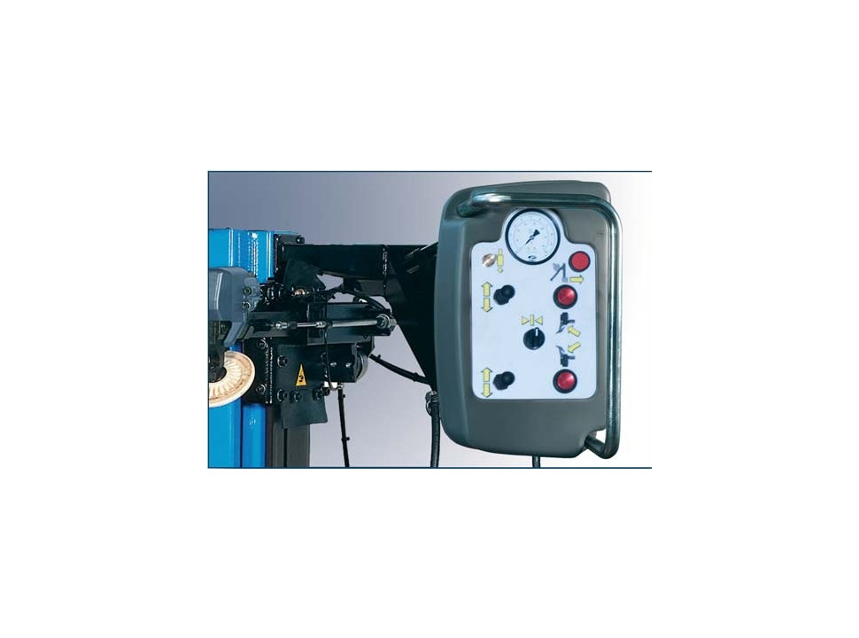 Práctico mando multifunciones, que comprende todos los comandos de trabajo, para facilitar el destalonado dinámico, independiente o conjunta, de ambos talones del neumático con el sistema de los dos discos telescópicos.