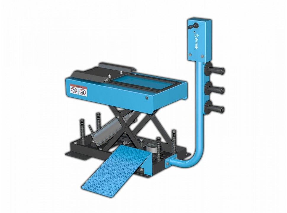 El elevador de neumáticos SKL-65 permite levantar en forma rápida y fácilmente ruedas pesadas en el eje de la balanceadora.