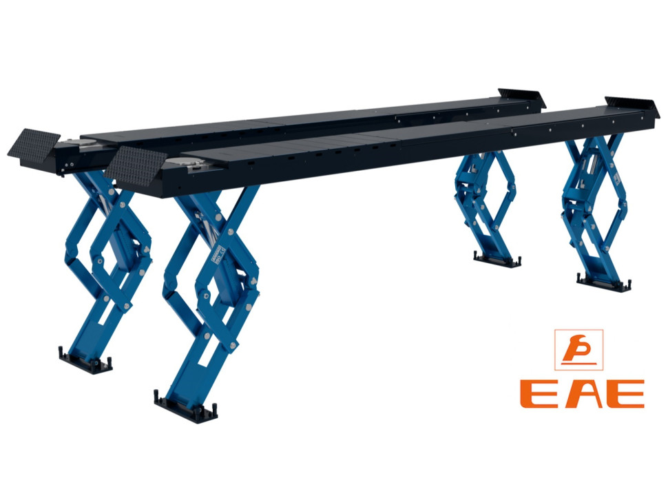 Elevador independiente de 2 plataformas EAE EX8 de 8,0 t, con control inalámbrico para sincronización precisa, altura máxima 2.150 mm y plataformas de 6,0 o 7,0 m. Cada plataforma integra grupo electrohidráulico propio, maximizando el espacio libre alrededor y debajo del vehículo.