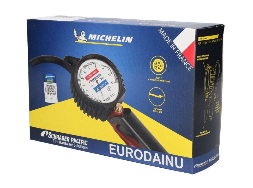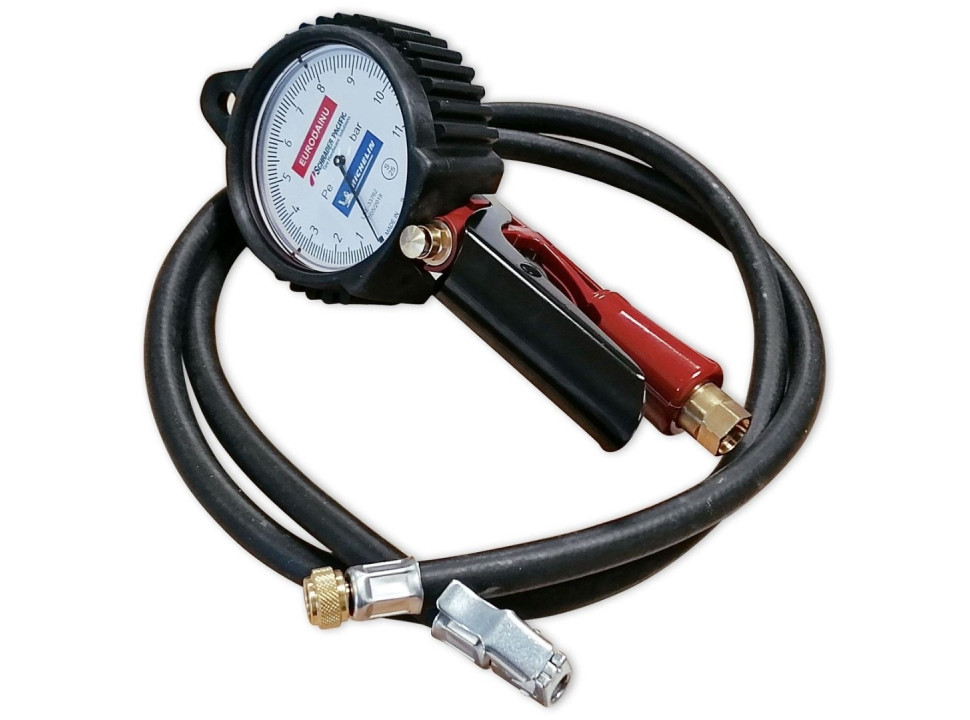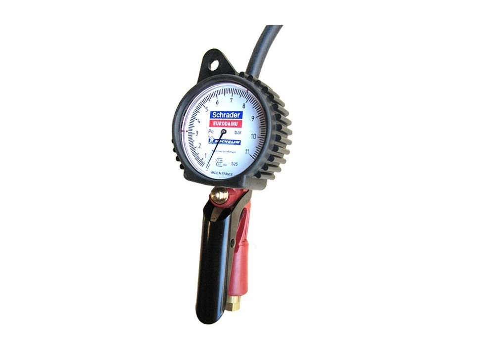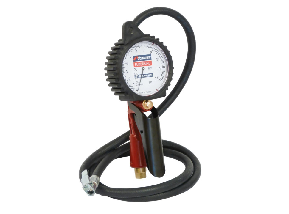 Este inflador - medidor "Eurodainu" de Schrader es un instrumento profesional diseñado para uso intensivo en talleres de neumáticos (gomerías), servicio de flotas, estaciones de servicio. Ofrece una escala dual (psi / bar) hasta ~160 psi (11 bar) lo que permite medir y ajustar la presión de neumáticos automotrices, camionetas y equipos que requieren presiones elevadas. Cuenta con manguera, cabezal seguro y protección contra el uso en condiciones exigentes.
