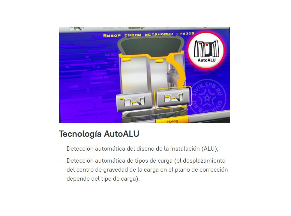 Tecnología AutoALU: Detecta automáticamente el patrón de instalación de pesos (ALU) después de ingresar las dimensiones de la rueda, así como los tipos de pesos, teniendo en cuenta el desplazamiento del centro de gravedad en el plano de corrección.
