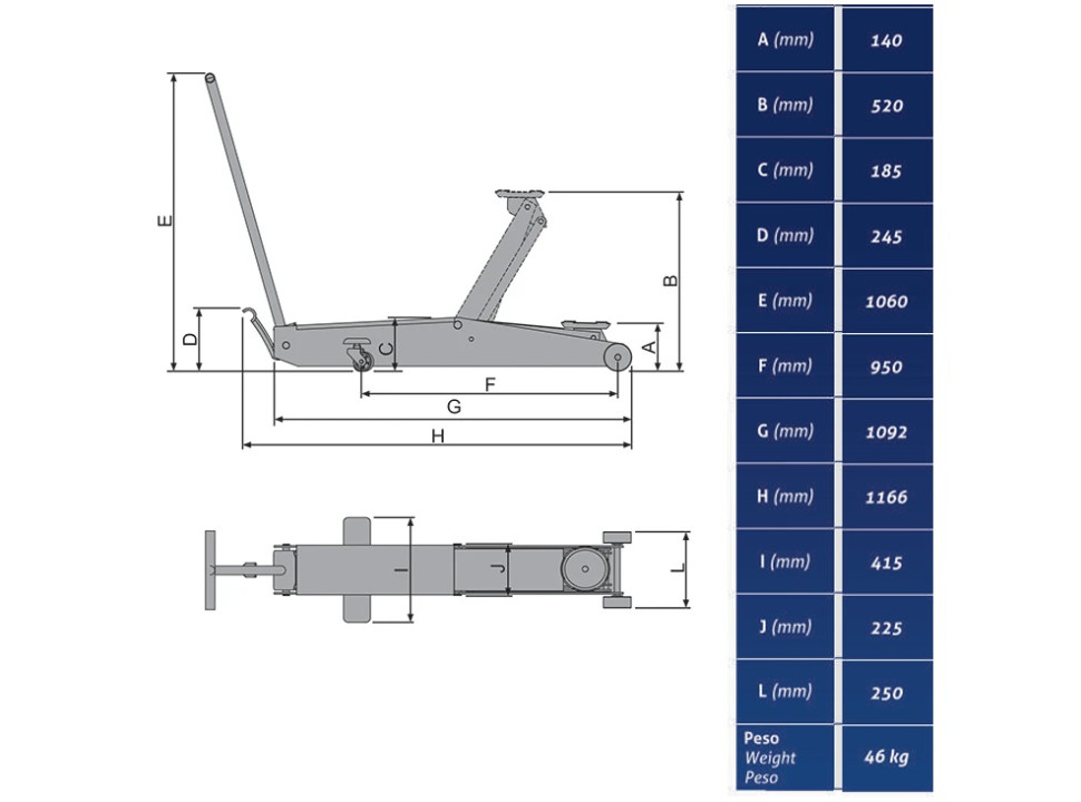 El J3200 ofrece operación segura y controlada en tareas de elevación cotidiana en autos y vans. Incorpora válvula de sobrecarga para proteger el sistema hidráulico y control de descenso preciso para maniobrar con seguridad bajo carga. Su mango ergonómico facilita el posicionamiento y las ruedas de baja rumorosidad ayudan a proteger el piso del taller.