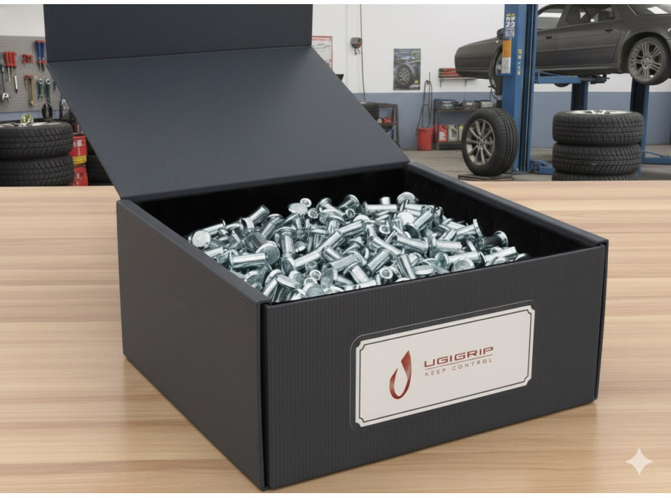 El diseño de traba simple (Singleflange) facilita una instalación estable y segura en neumáticos con estructura estándar para vehículos de turismo. Además, UGI-GRIP ofrece opciones de recubrimiento completo (pin + cuerpo) en varios colores como blanco, amarillo, rojo cobre, gris y negro, adaptándose a distintas necesidades técnicas y estéticas.
