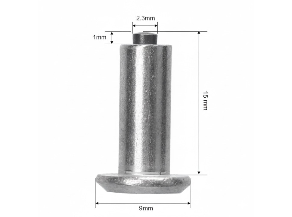 La parte superior del clavo (pin) presenta un diámetro de Ø 2,30 mm, mientras que el vástago (shank) mide Ø 4,90 mm, proporcionando un anclaje firme y seguro. El aumento en la longitud total a 15 mm permite una penetración más profunda para una tracción mejorada sobre superficies resbaladizas.
