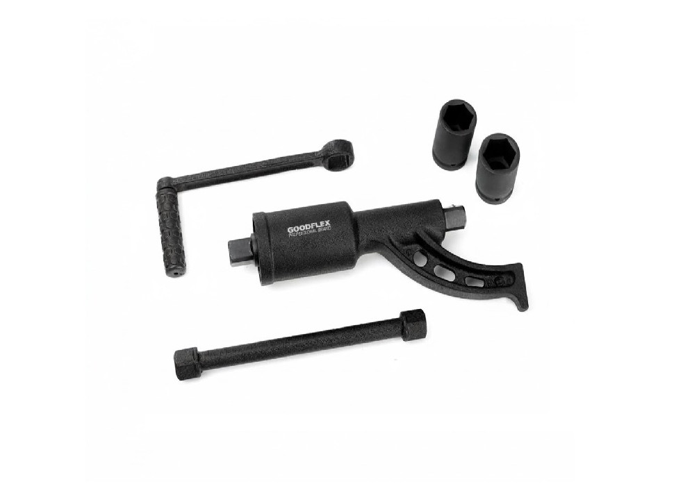 El diseño puede incluir adaptadores o tubos de extensión para alcanzar tuercas de 30, 32 o 33 mm, según el sistema de ruedas más frecuente. La herramienta debe incorporar mecanismos de bloqueo, seguro de posición o tope de giro para evitar daños internos.