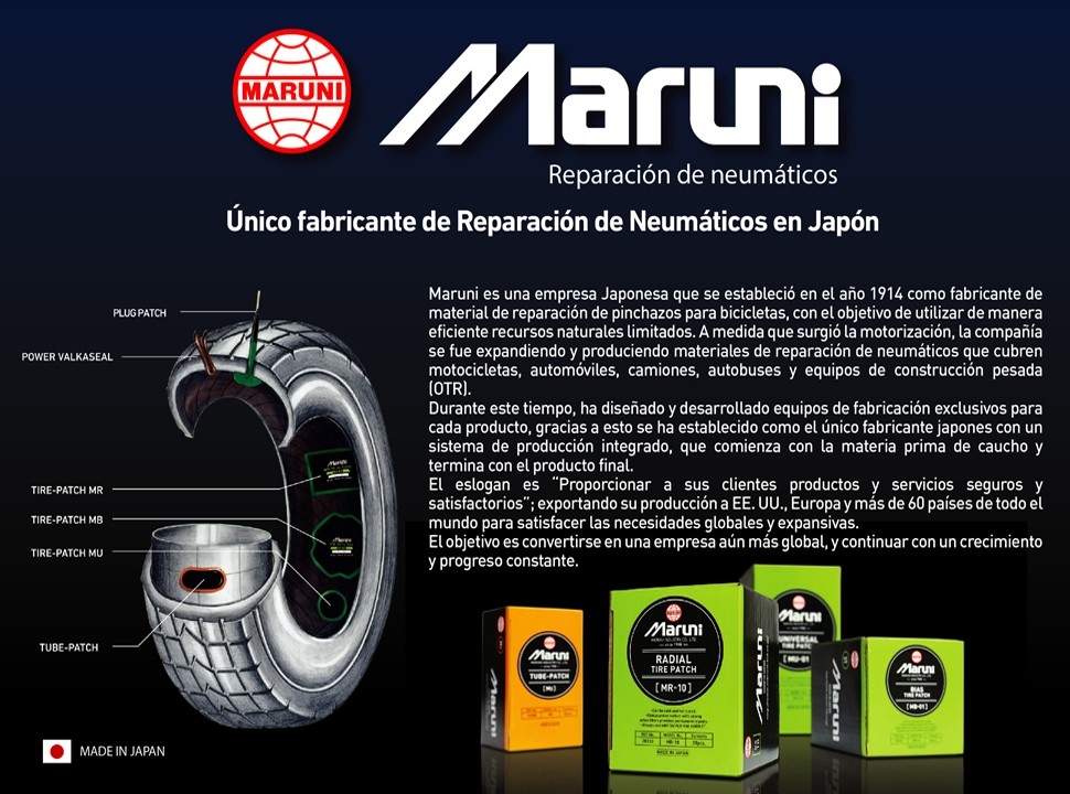 Los parches para cámaras de aire del fabricante Japonés MARUNI están destinados a la reparación permanente de cámaras de aire, así como a la instalación y sustitución de válvulas para cámara de neumáticos.