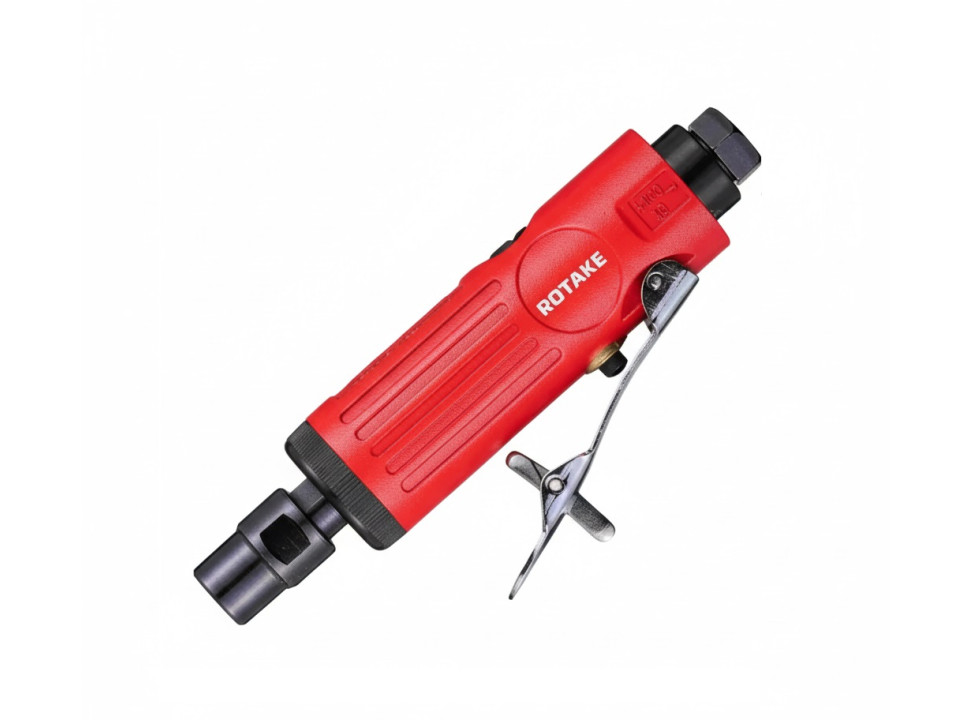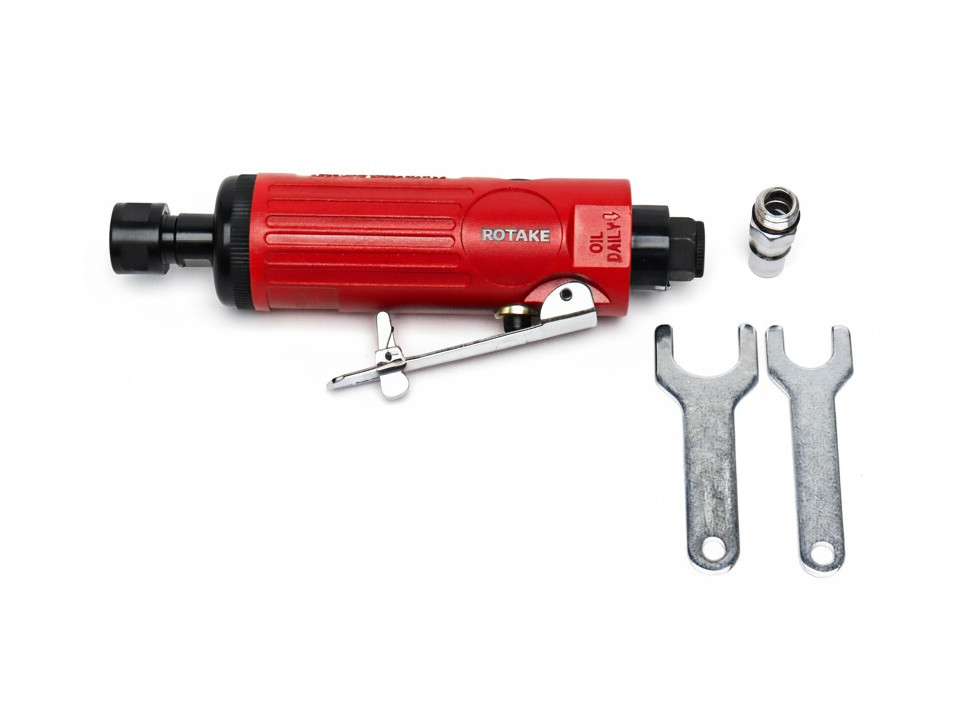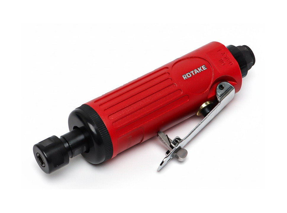 Pulidora/rectificadora neumática Rotake recta 1/4" de alta velocidad (22.000 rpm) con escape trasero y kit de pinzas 1/4" y 1/8". Ideal para preparación de superficies, desbaste fino, pulido y lijado en taller.