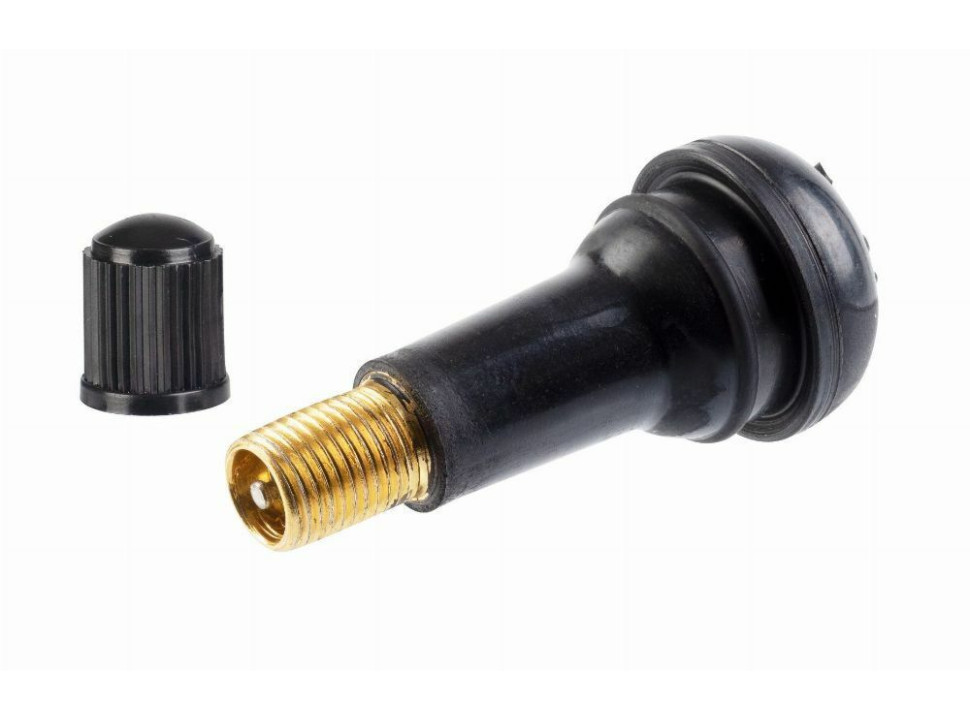 Válvula de goma EPDM para ruedas de turismos sin cámara, tipo TR-413, con vástago de latón y un alto total de 42,5 mm. Para un diámetro de agujero de la llanta de 11,3 mm y una presión máxima 4,5 bares. Incluye óvulo y tapa plástica.